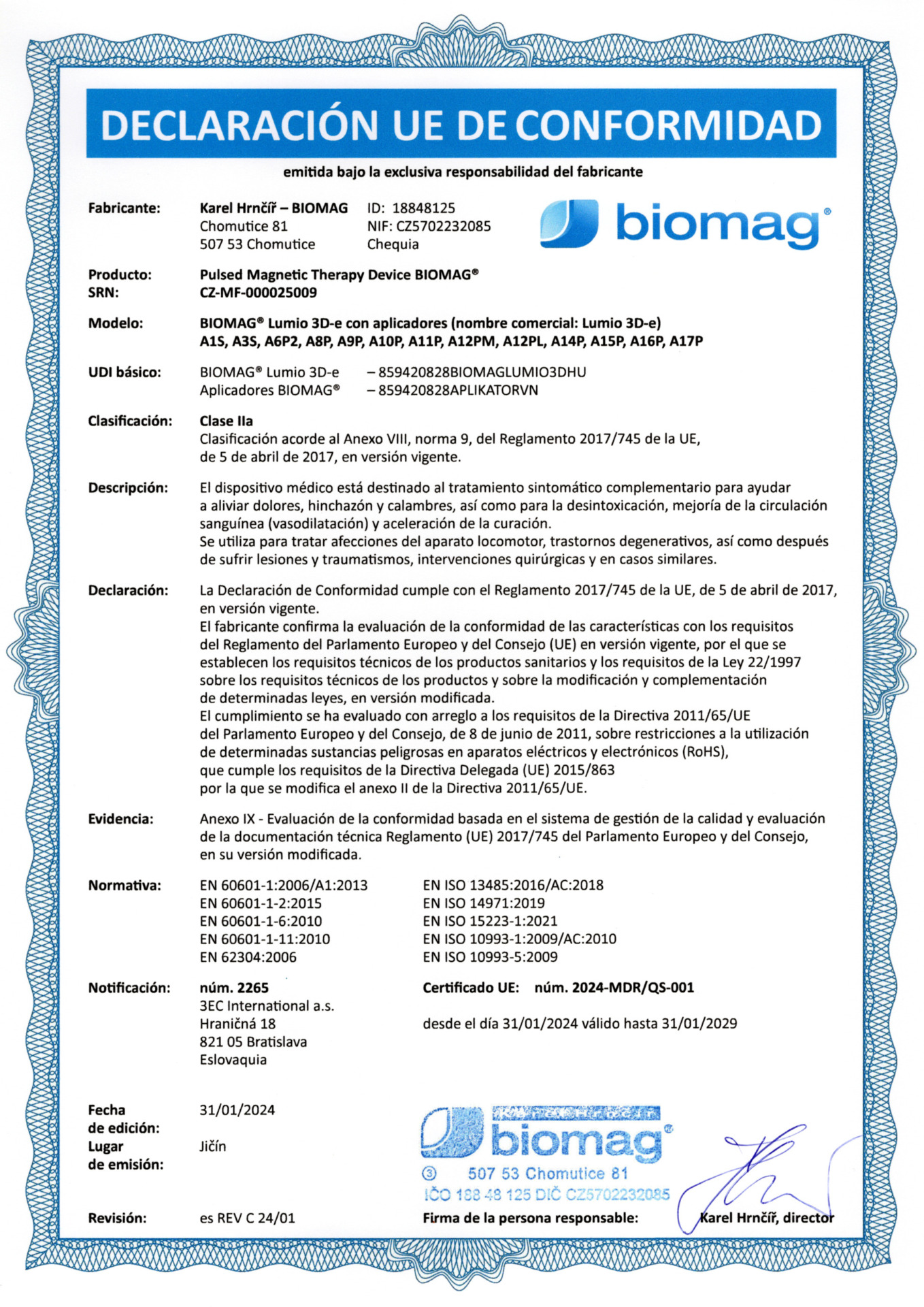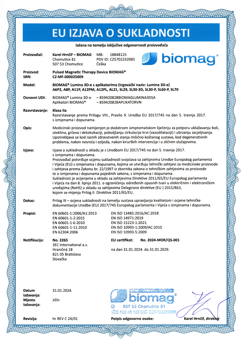 Certifikát dokazuje, že veterinárny technický prostriedok BIOMAG® Lumina 3D-e VET, Lumio 3D-e VET môže byť vyrábaný a uvádzaný na trh na veterinárne účely.